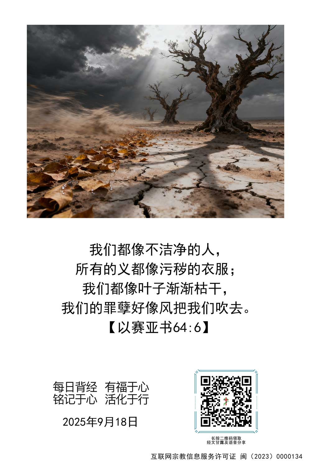 9月18日经文:【以赛亚书64:6】我们都像不洁净的人,所有的义都像污秽的衣服;我们都像叶子渐渐枯干,我们的罪孽好像风把我们吹去。