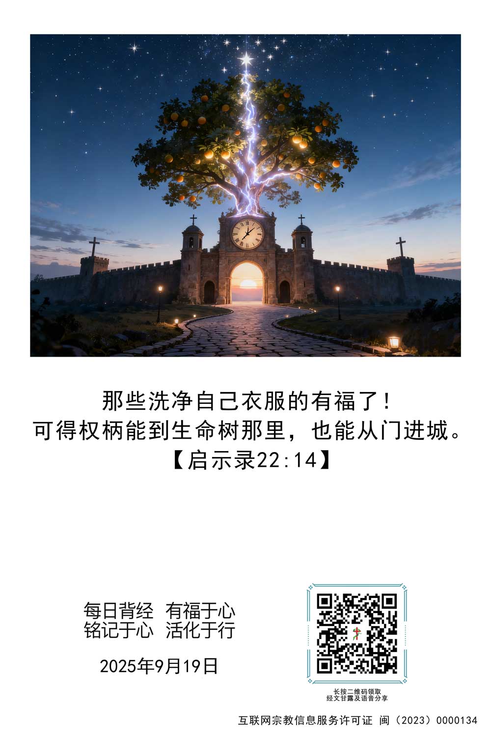 9月19日经文:【启示录22:14】那些洗净自己衣服的有福了!可得权柄能到生命树那里,也能从门进城。