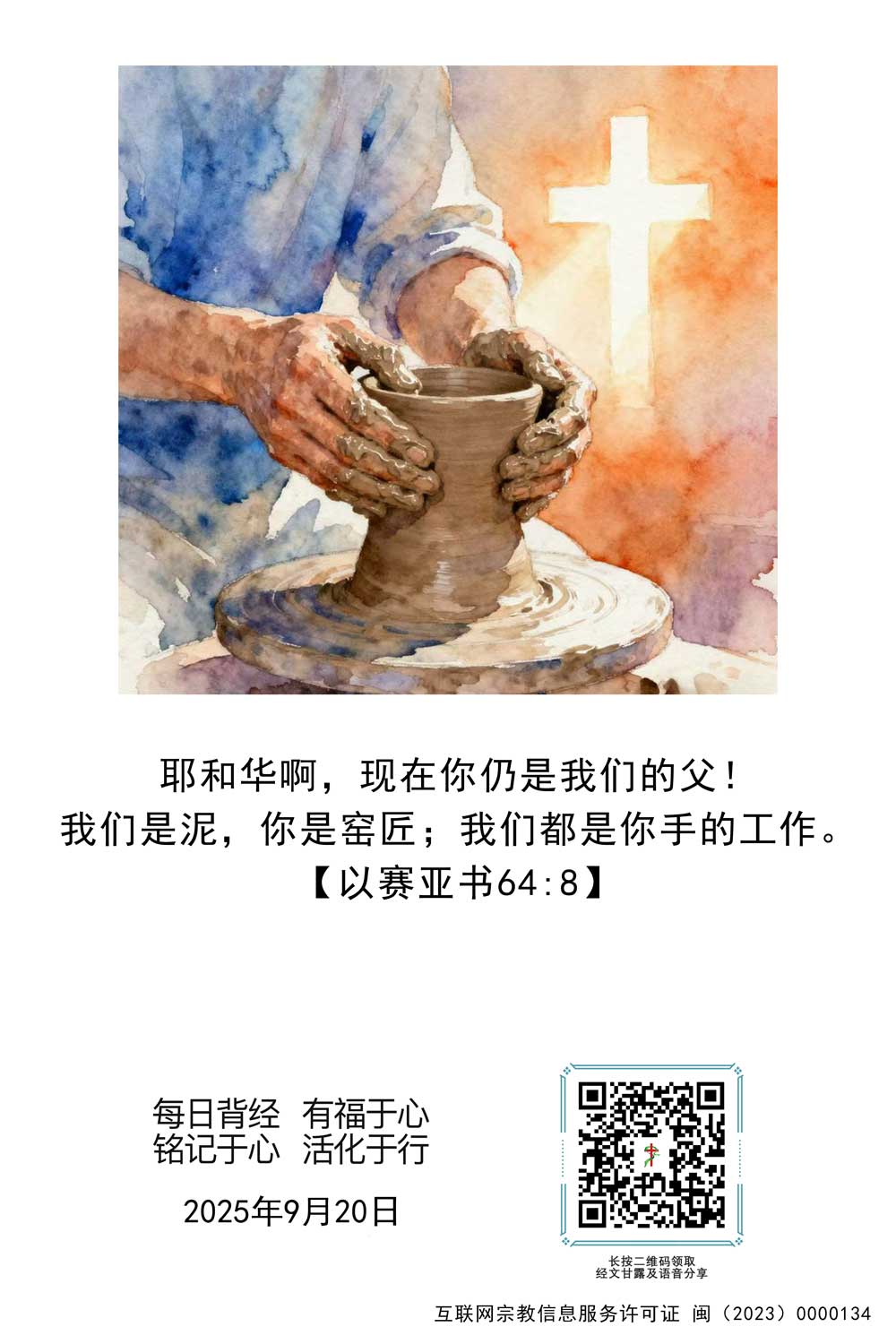 9月20日经文:【以赛亚书64:8】耶和华啊,现在你仍是我们的父!我们是泥,你是窑匠;我们都是你手的工作。