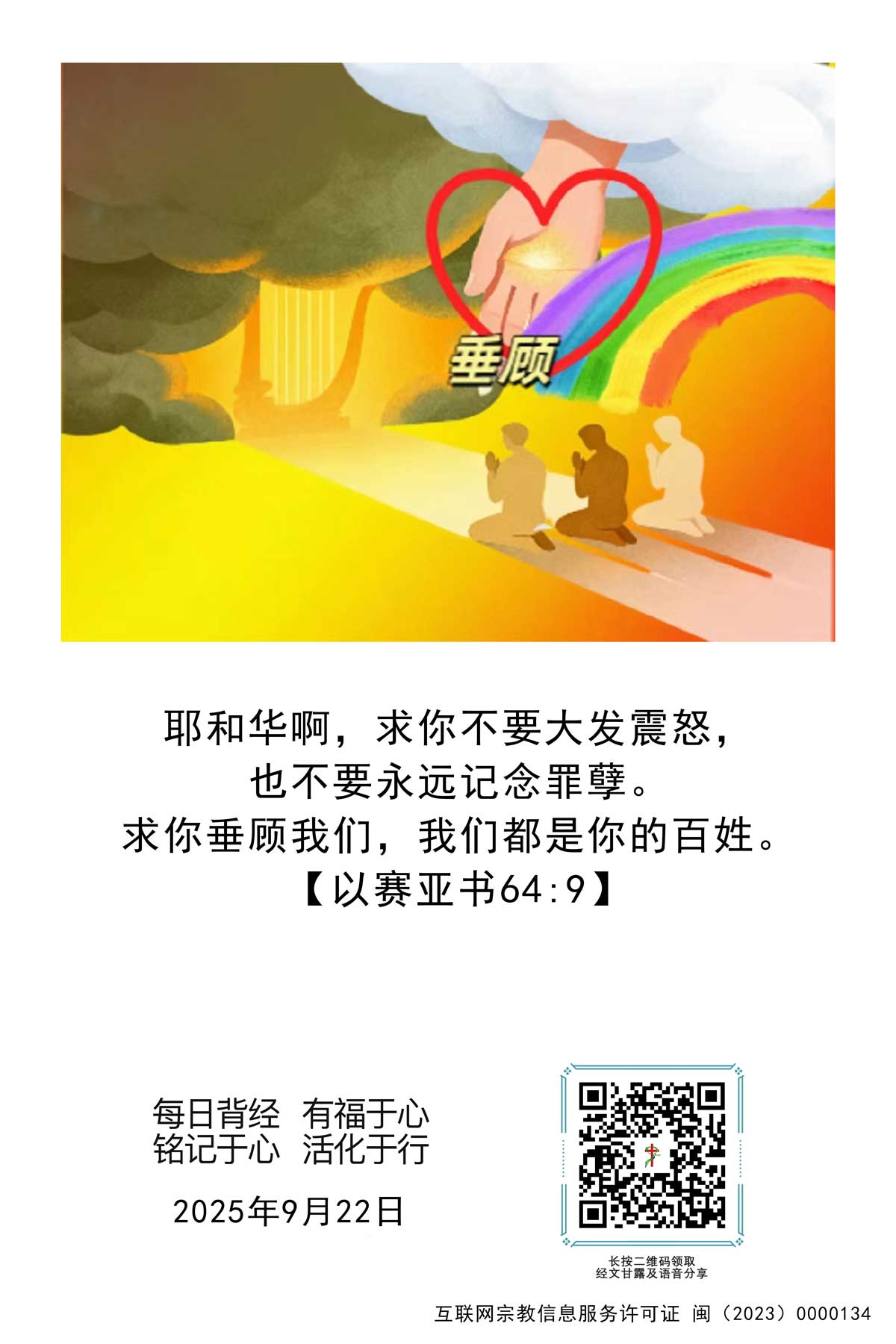 9月22日经文:【以赛亚书64:9】耶和华啊,求你不要大发震怒,也不要永远记念罪孽。求你垂顾我们,我们都是你的百姓。