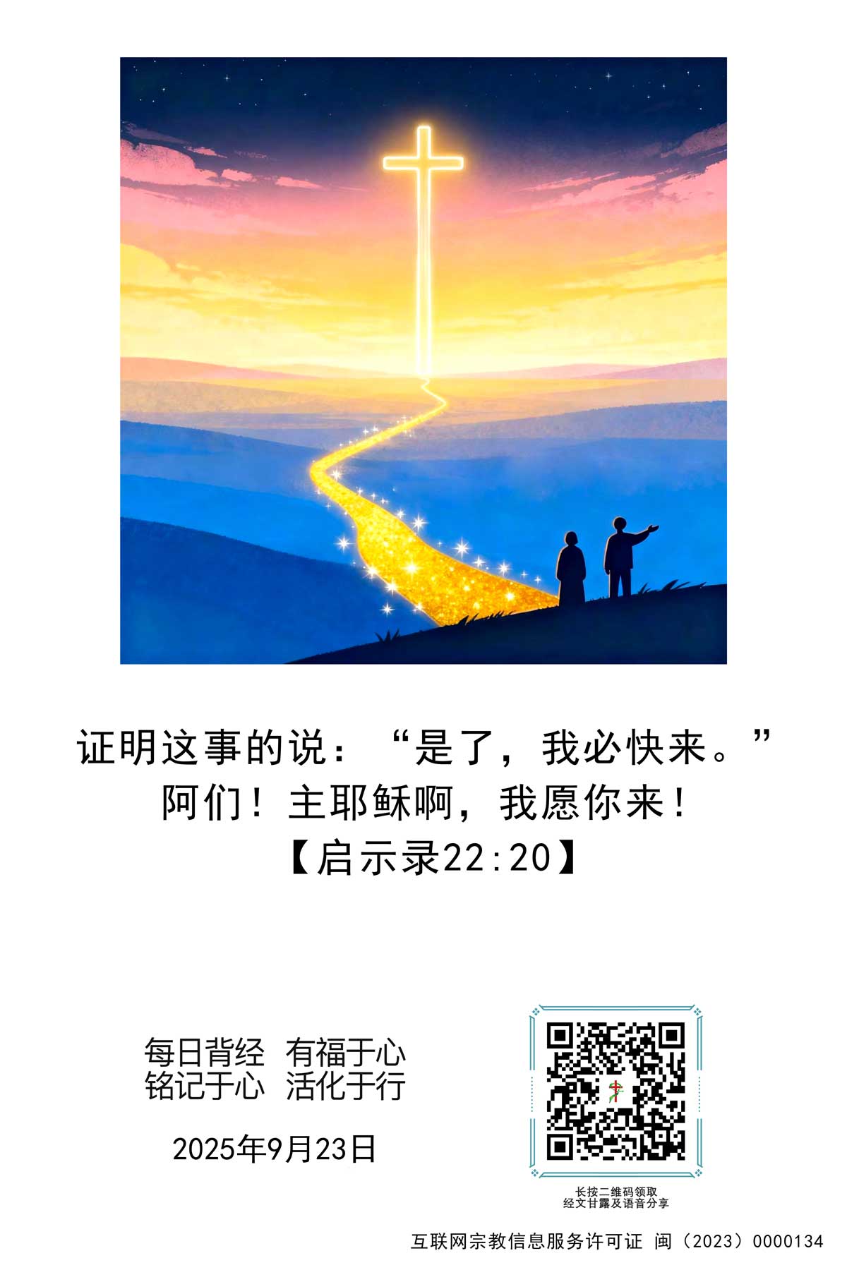 9月23日经文:【启示录22:20】证明这事的说:“是了,我必快来。”阿们!主耶稣啊,我愿你来!