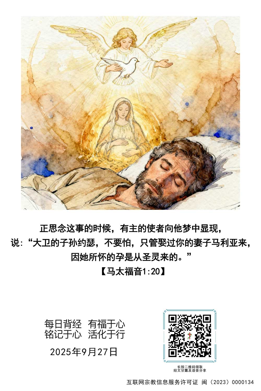 9月27日经文:【马太福音1:20】正思念这事的时候,有主的使者向他梦中显现,说:“大卫的子孙约瑟,不要怕,只管娶过你的妻子马利亚来,因她所怀的孕是从圣灵来的。”