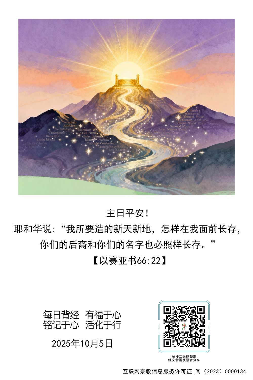 10月5日经文:【以赛亚书66:22】耶和华说:“我所要造的新天新地,怎样在我面前长存,你们的后裔和你们的名字也必照样长存。”