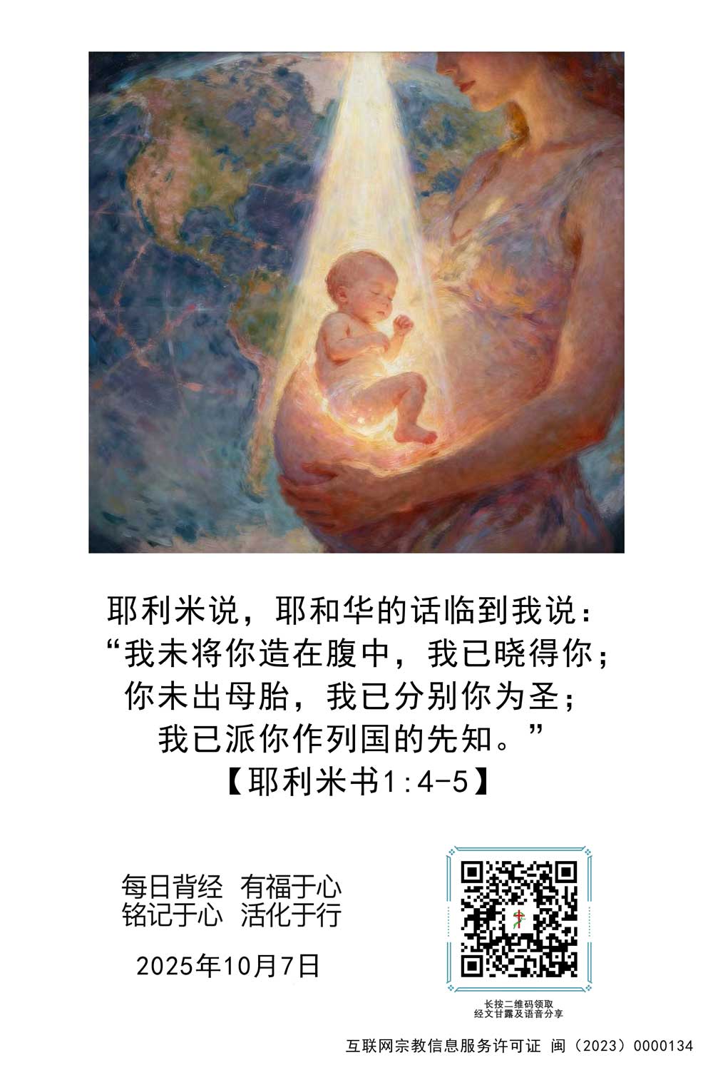 10月7日经文:【耶利米书1:4-5】耶利米说,耶和华的话临到我说:“我未将你造在腹中,我已晓得你;你未出母胎,我已分别你为圣;我已派你作列国的先知。”
