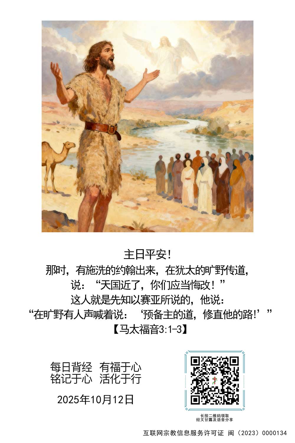 10月12日经文:【马太福音3:1-3】那时,有施洗的约翰出来,在犹太的旷野传道,说:“天国近了,你们应当悔改!”这人就是先知以赛亚所说的,他说:“在旷野有人声喊着说:‘预备主的道,修直他的路!’”