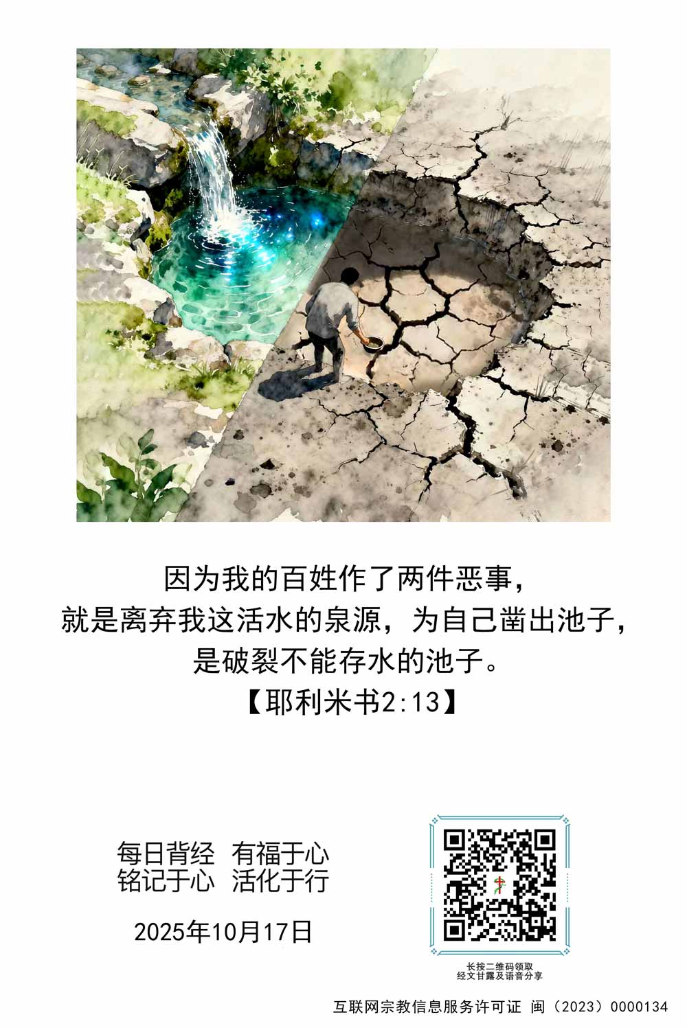 10月17日经文:【耶利米书2:13】因为我的百姓作了两件恶事,就是离弃我这活水的泉源,为自己凿出池子,是破裂不能存水的池子。