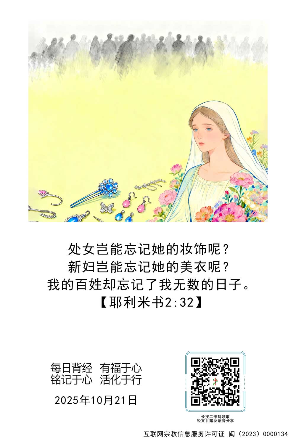 10月21日经文:【耶利米书2:32】处女岂能忘记她的妆饰呢?新妇岂能忘记她的美衣呢?我的百姓却忘记了我无数的日子。