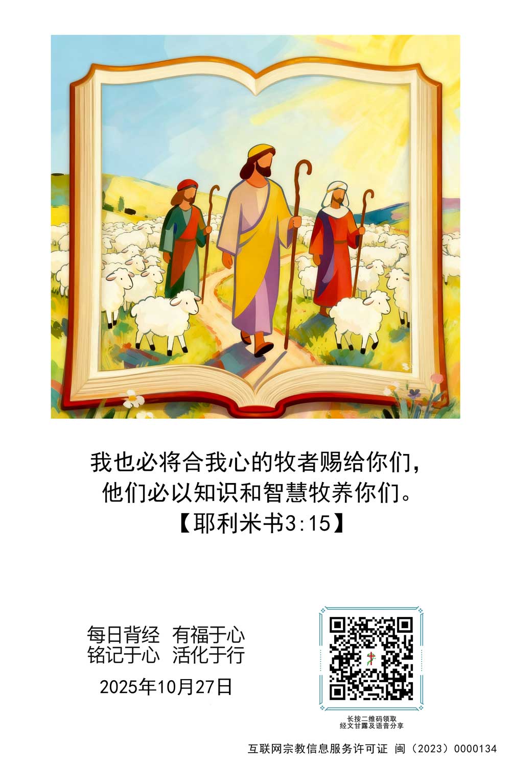 10月27日经文:【耶利米书3:15】我也必将合我心的牧者赐给你们,他们必以知识和智慧牧养你们。