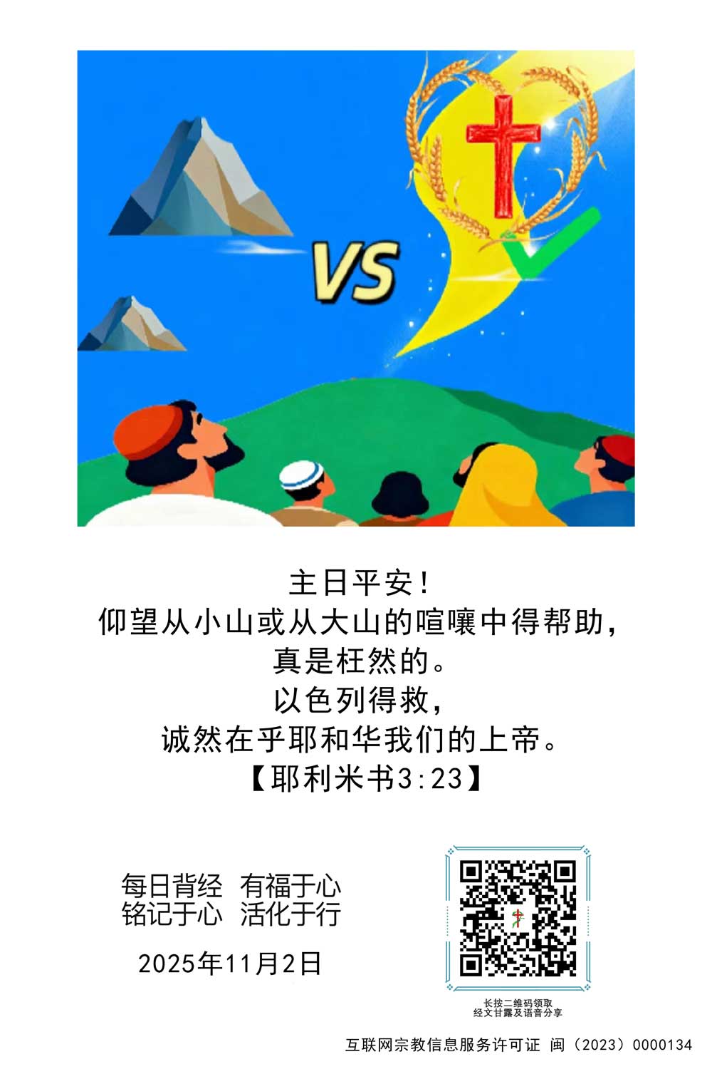 11月2日经文:【耶利米书3:23】仰望从小山或从大山的喧嚷中得帮助,真是枉然的。以色列得救,诚然在乎耶和华我们的上帝。