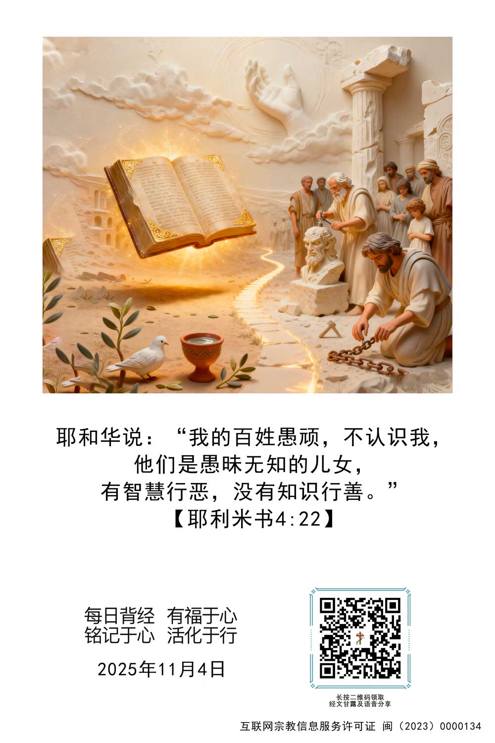 11月4日经文:【耶利米书4:22】耶和华说:“我的百姓愚顽,不认识我,他们是愚昧无知的儿女,有智慧行恶,没有知识行善。”