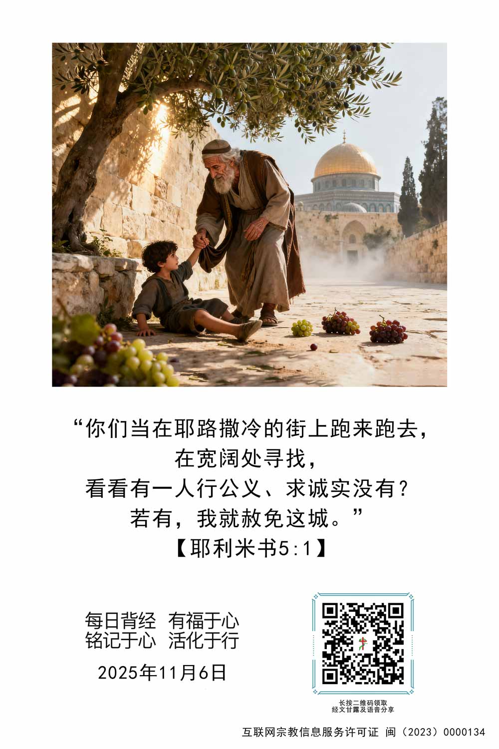 11月6日经文:【耶利米书5:1】“你们当在耶路撒冷的街上跑来跑去,在宽阔处寻找,看看有一人行公义、求诚实没有?若有,我就赦免这城。”