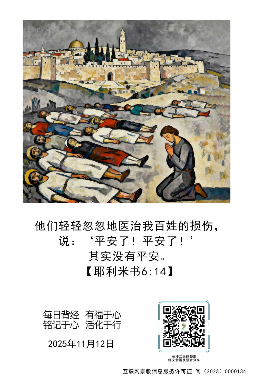 11月12日经文:【耶利米书6:14】他们轻轻忽忽地医治我百姓的损伤,说:‘平安了!平安了!’其实没有平安。