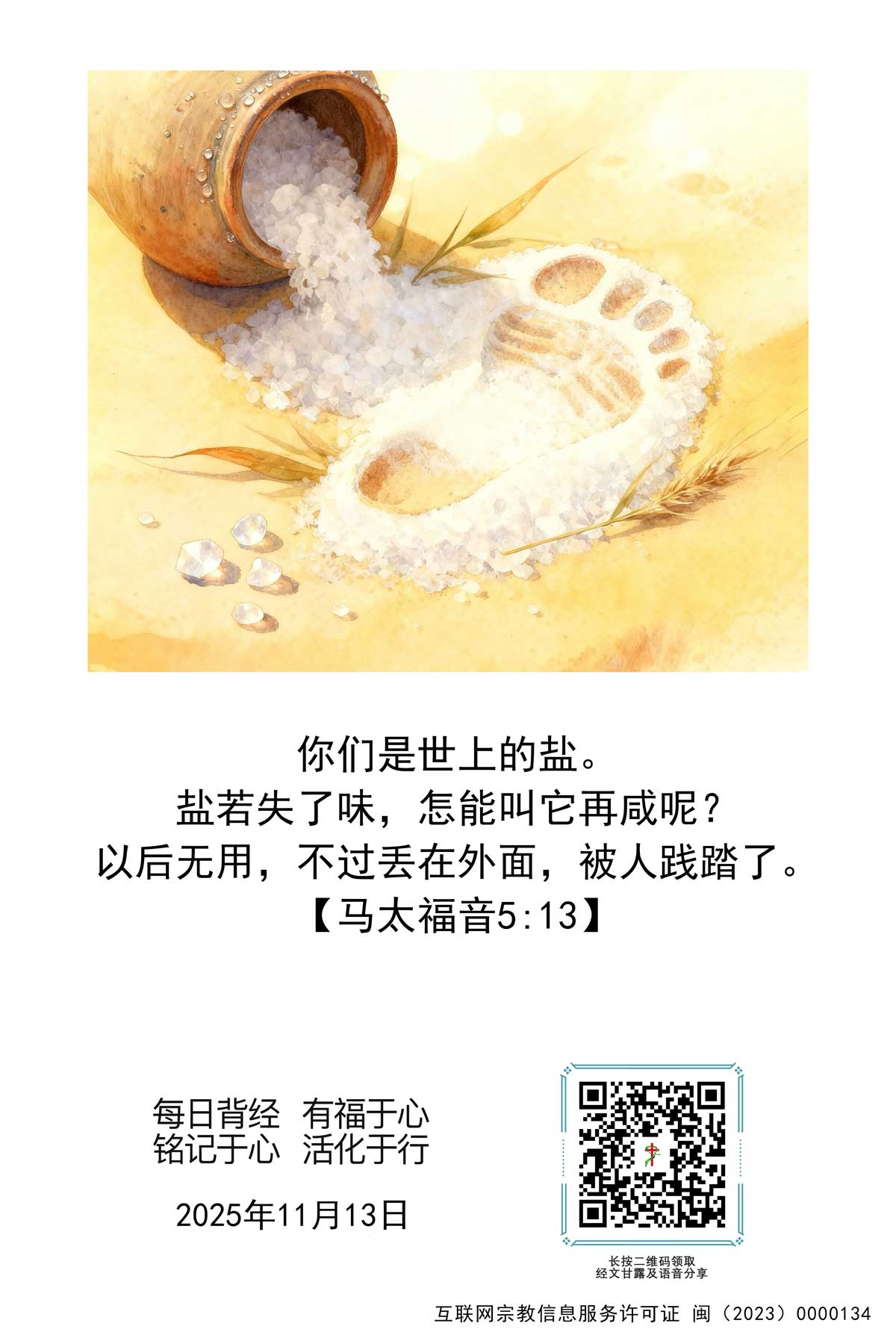 11月13日经文:【马太福音5:13】你们是世上的盐。盐若失了味,怎能叫它再咸呢?以后无用,不过丢在外面,被人践踏了。