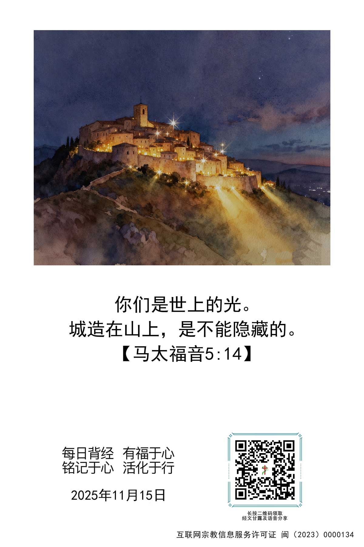11月15日经文:【马太福音5:14】你们是世上的光。城造在山上,是不能隐藏的。